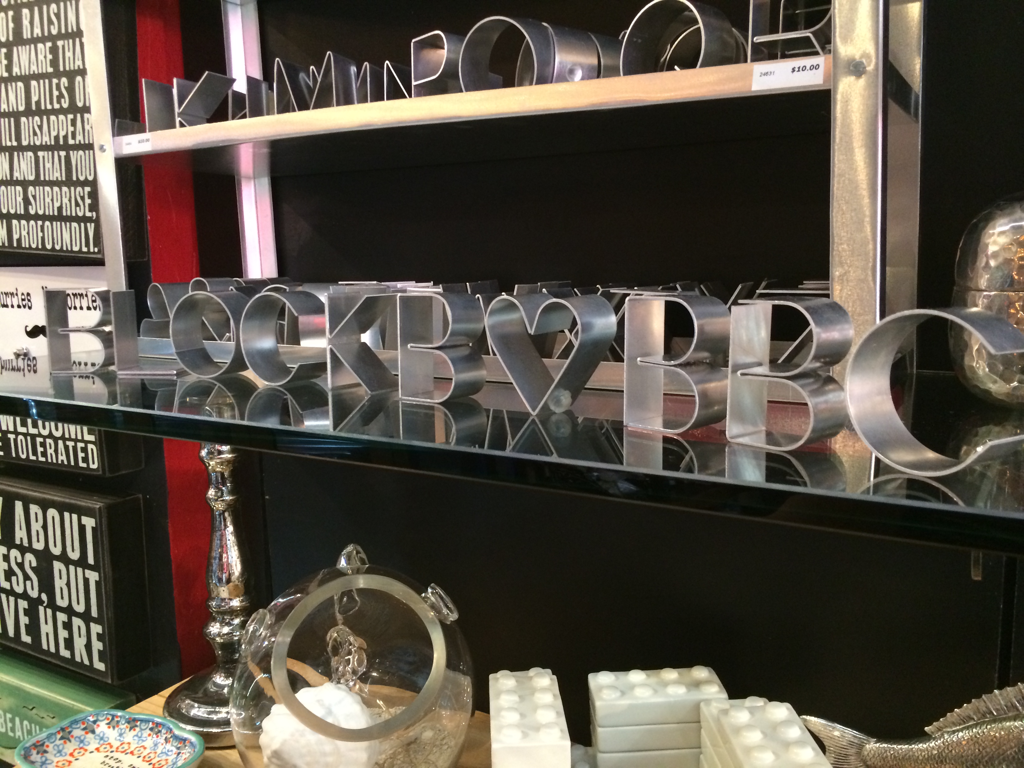 Aside from spending time on the beach, we spent a lot of the time wandering the shops in the Lincoln Road Mall. Lincoln Road Mall is essentially a long strip mall that was also right by our hotel. Where we would turn left to go to the beach, turn right and you were at the mall. There were so many cool shops and restaurants throughout that we really enjoyed exploring them. We went into one in particular called Koto. On one shelf they had these cool metal letters & symbols you could spell out various words with; when we